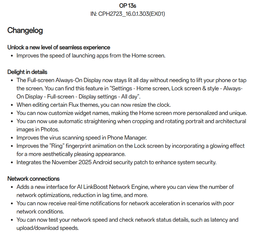 أعلنت شركة OnePlus عن بدء طرح التحديث التدريجي لنظام OxygenOS 16.0.1.303 لجهاز OnePlus 13s، وهو أول تحديث للجهاز منذ الترقية إلى OxygenOS 16 المبني على نظام Android 16. يجلب هذا التحديث تحسينات في الأداء وميزات جديدة لجهازها الرائد.