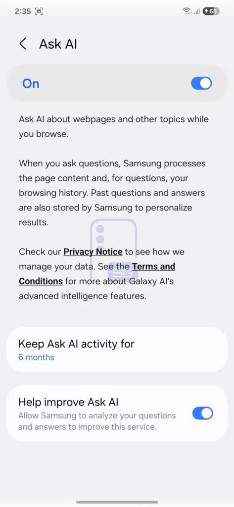 تظهر الردود في تنسيق محادثة منظم، مع إمكانية إدارة تاريخ المحادثة لضمان الخصوصية. من المتوقع أن تكون هذه الميزة متاحة في البداية لأجهزة Galaxy المدعومة بالذكاء الاصطناعي.