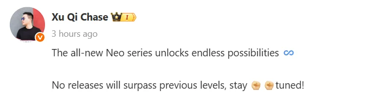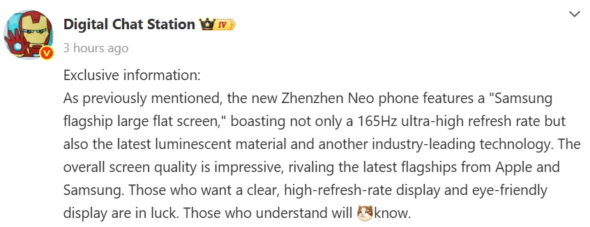 في منشور جديد على ويبو، أشار نائب رئيس ريلمي ورئيس التسويق العالمي، شيو تشي، إلى أن سلسلة “نيو” القادمة ستقدم ترقيات ملحوظة بدلاً من تغييرات طفيفة. وهذا يتماشى مع الصورة المتداولة لهاتف “ريلمي نيو 8 إنفينيتي إديشن” على وسائل التواصل الاجتماعي الصينية، التي تكشف عن استخدام شاشة من إنتاج شركة سامسونج.