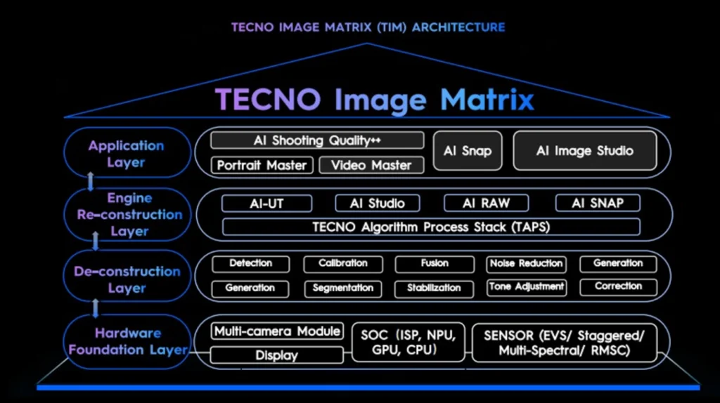 سلطت الشركة الضوء على تطور بنية “مصفوفة صور TECNO” (TIM)، التي تجمع بين العدسات المعززة بالذكاء الاصطناعي، والخوارزميات الحسابية المتقدمة، والتحكم المدعوم بالذكاء الاصطناعي. يركز TIM على فهم نية المستخدم، وخصائص الموضوع، والنغمة العاطفية للصورة. كما يدعم نظام “النغمة العالمية” الخاص بـ TECNO لتحقيق إعادة إنتاج دقيقة لدرجات لون البشرة. أصبح TIM الآن أساسًا لجميع تقنيات التصوير القادمة من TECNO.