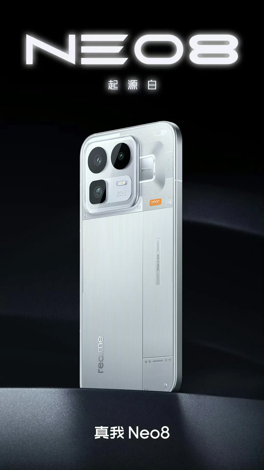 تظهر الصور أعلاه هاتف Realme Neo 8 بالألوان التالية: الأبيض الأصلي، الرمادي الميكانيكي، والأرجواني السيبراني. يُشاع أن الهاتف يأتي مع ظهر زجاجي وإطار معدني في المنتصف. وعند إلقاء نظرة أقرب على اللوحة الخلفية للهاتف، يمكن ملاحظة إضاءة RGB مشابهة لتلك التي كانت موجودة في هاتف Realme GT Neo 5 السابق.