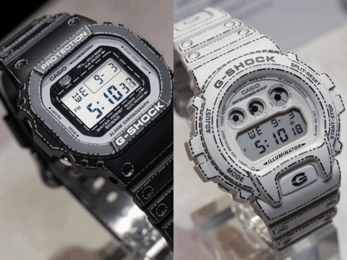 تتميز ساعة DW‑5600RGM‑1 بخطوط مطبوعة تحاكي حواف العلبة وأجزاء السوار، مع تصميم يشبه الدليل للقص والطي. بينما تأتي DW‑6900RGM‑5 بلون أبيض مع رسومات رمادية، مما يبرز تصميمها الفريد. هذه التفاصيل الدقيقة تجعل الساعتين مثيرتين للإعجاب، خاصة تحت الأضواء الساطعة.