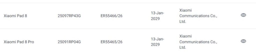 حصلت أجهزة Xiaomi اللوحية القادمة، التي تحمل أرقام الطراز 25097RP43G و25091RP04G، على موافقة من هيئة TDRA في الإمارات. تؤكد هذه القوائم أن الأجهزة ستحمل الأسماء التسويقية النهائية Xiaomi Pad 8 وXiaomi Pad 8 Pro، على التوالي.