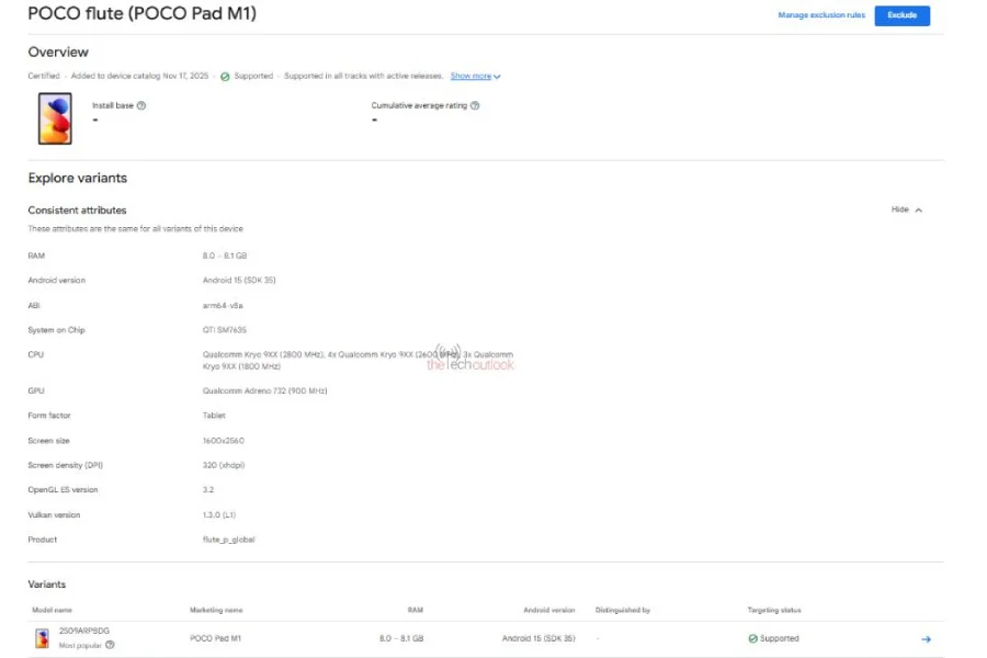 يظهر الجهاز اللوحي تحت رقم الطراز 2509ARPBDG، واسم داخلي فلوت. ومن المثير للاهتمام أن شركة شاومي تستخدم نفس اسم الطراز لجهاز Redmi Pad 2 Pro، مما يشير إلى أن Poco Pad M1 قد يكون إعادة تسمية لجهاز Pad 2 Pro.