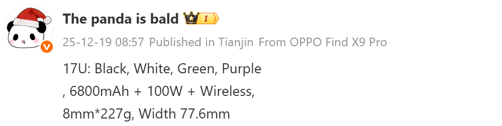 بالعودة إلى تسريبات 17 Ultra، فإن أبعاده تبلغ 77.6 × 8 ملم، ويزن 227 جرامًا. بالمقارنة، فإن هاتف 15 Ultra يقيس 75.3 × 9.4 ملم ويزن إما 226 أو 229 جرامًا.