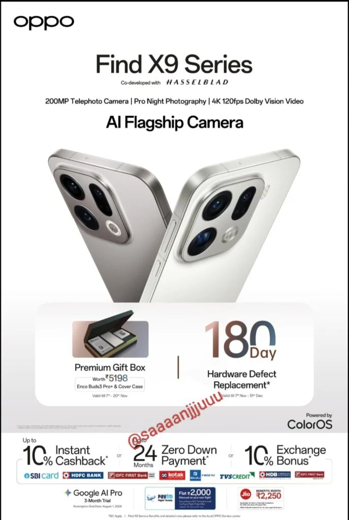 جاءت أحدث التسريبات من المسرب المعروف سانجو تشودري، الذي شارك التفاصيل عبر منصة X (المعروفة سابقًا بتويتر). في تغريدته الأخيرة، زعم أن العملاق التكنولوجي الصيني سيقدم مجموعة من المكافآت للمستخدمين الذين يقومون بالحجز المسبق لجهاز Find X9 وFind X9 Pro. وتشمل المكافآت صندوق هدايا فاخر تصل قيمته إلى حوالي 5,198 روبية هندية، حيث يحتوي على غلاف واقٍ وسماعات Oppo Enco Buds 3 Pro+ TWS.
