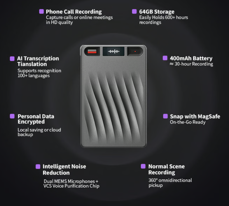 يبلغ وزن RECPOINT NOTE فقط 33 جرامًا وسماكته 0.14 إنش، مما يجعله سهل الحمل للغاية. يدعم الجهاز تقنية MagSafe للتثبيت المغناطيسي السهل، ويحتوي على شاشة OLED تعرض حالة التسجيل المباشر، ومستوى البطارية، وتوصيل بلوتوث، وغيرها من المعلومات. هذا الجهاز بحجم بطاقة الائتمان مصمم لتعزيز الإنتاجية أثناء التنقل.