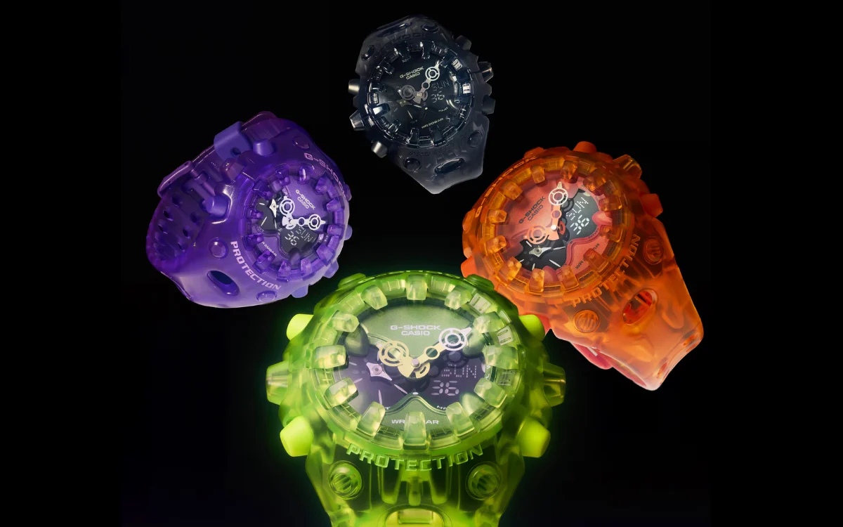 ما هي: إصدار جديد من G-Shock GA-V01 بتصميم شفاف، متوفر بأربعة ألوان شفافة (الأخضر النيون، البرتقالي، الأرجواني، والرمادي) مع وجه مميز متعدد الطبقات.